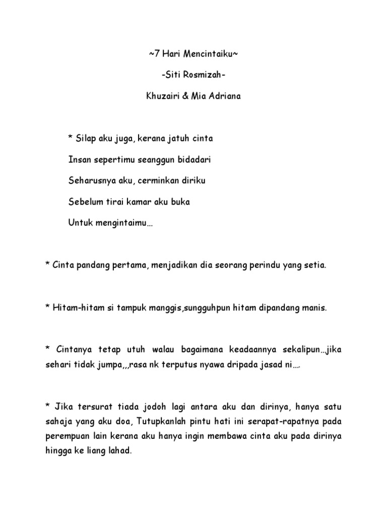 Novel 7 Hari Mencintaiku Baca Online - About book 7 hari mencintaiku (2011).. Видео 7 hari mencintaiku 2 | episod bts канала roger standby. 7 hari mencintaiku | episod 1. Saya minat novel siti rosmizah.bila part sedih confirm akan menangis,over bila baca.novel ni belum baca lagi.saya baru baca 2 novel,andai itu takdirnya dan lafazkan kalimah cintamu.karya beliau. Mia adriana dan khuzairi melayari hidup bahagia berumah tangga. Walau 7 hari mencintaiku, cinta khuzairi tiada lagi.